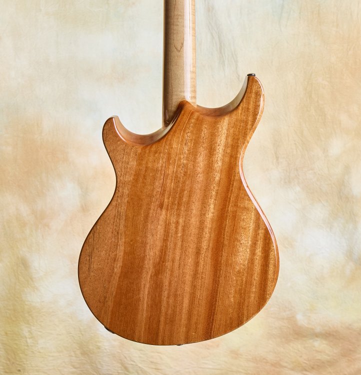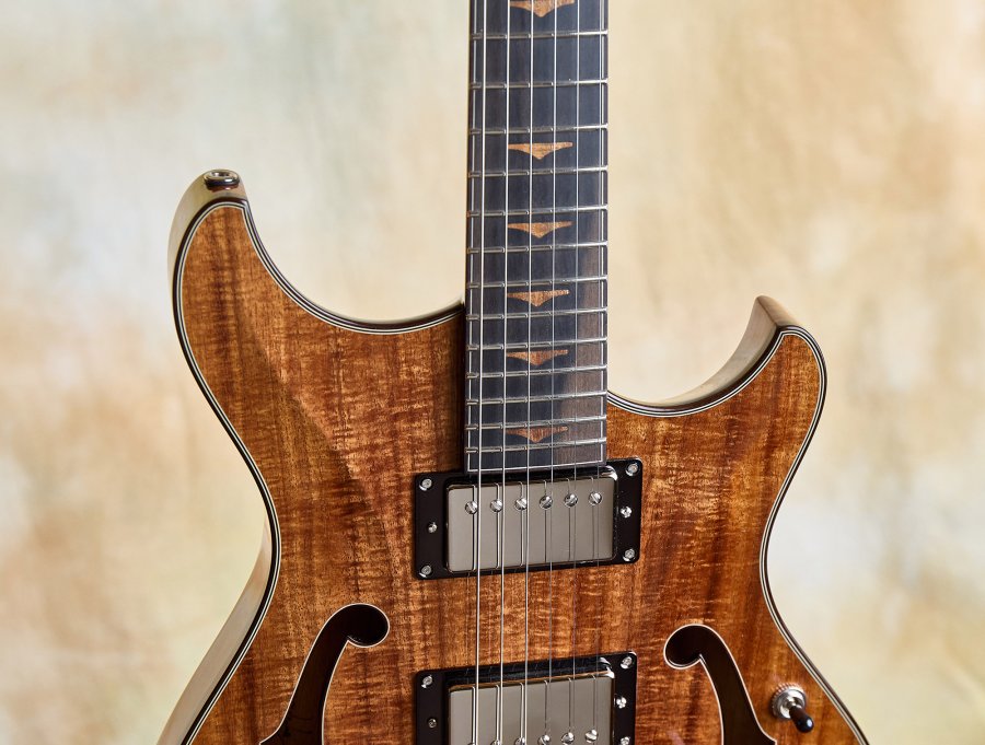 - Flamed Koa Top with Nicaraguan Rosewood Binding and Koa Inlays