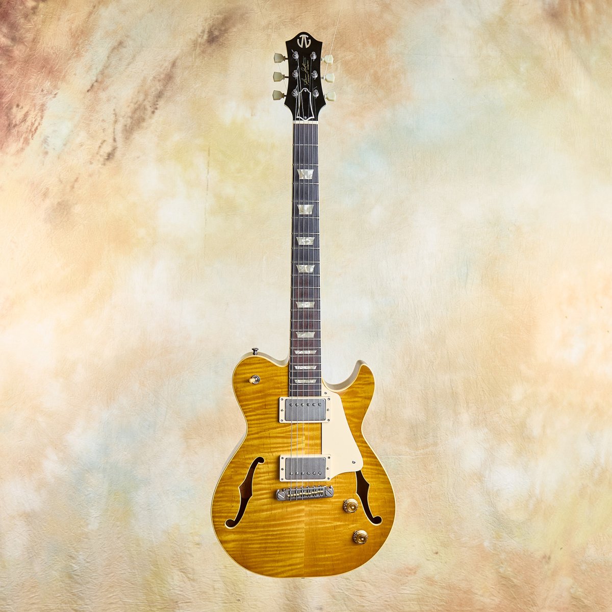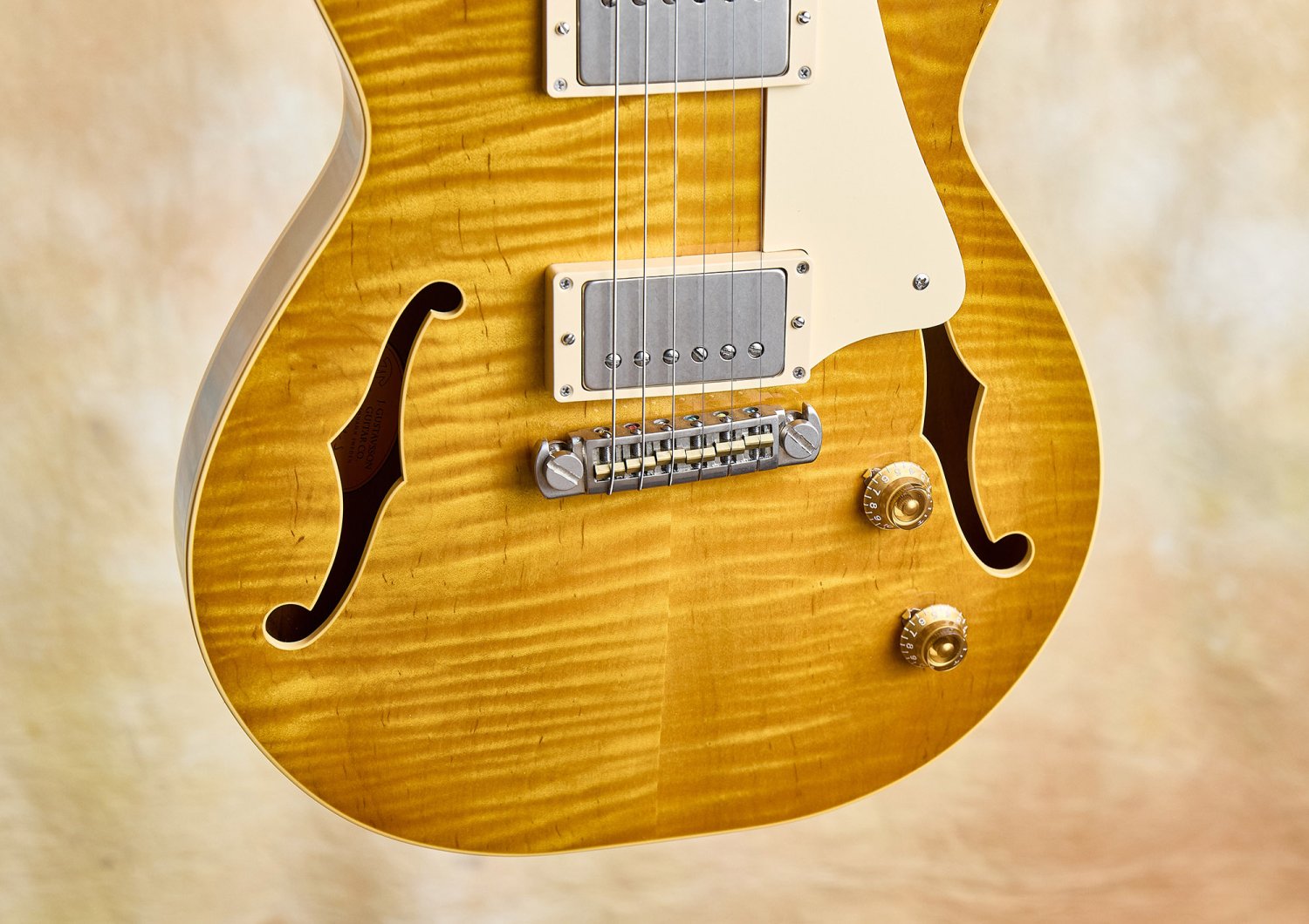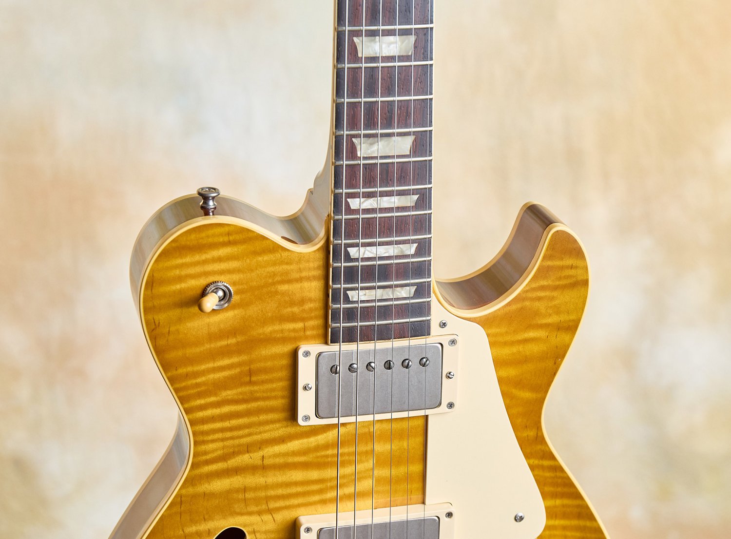 The flamed 3D maple top is stunning, with just the right amount of mineral streaks that evoke a vintage burst. The Brazilian rosewood fingerboard adds both visual beauty and a familiar, rich playing surface. The Throbak pickups are the perfect choice for this instrument, delivering that vintage voice with all the character and responsiveness you'd expect.