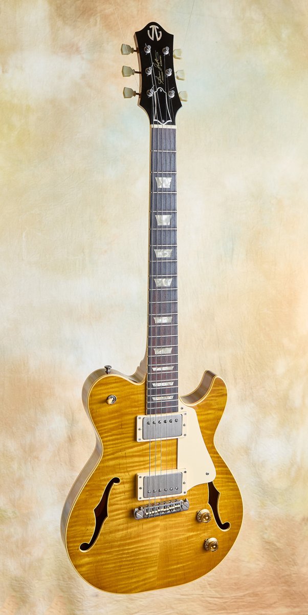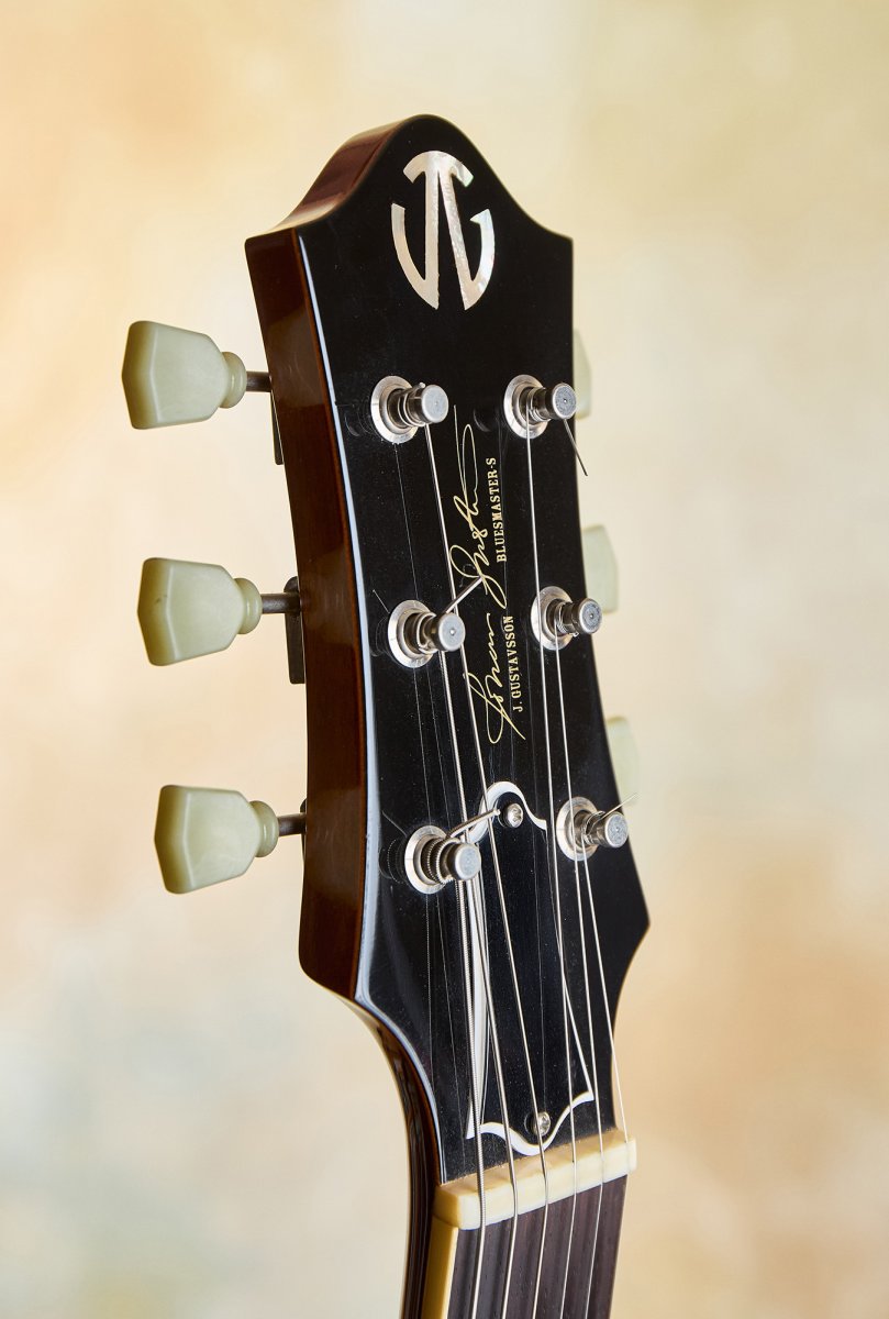 The guitar speaks for itself. It has everything you'd want in a Bluesmaster, yet the semi-hollow construction brings another level of tonality into the mix. There's a particular bloom, a woodiness, and harmonic transience that goes beyond Johan's solid-body Bluesmasters. The notes have just the right amount of compression. It's about as sweet as you can get. This is an outstanding example of Johan's work, a masterful instrument that takes semi-hollow construction to the highest level.