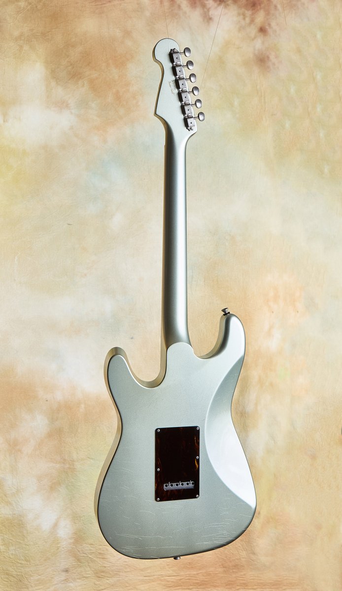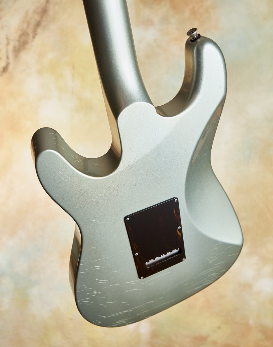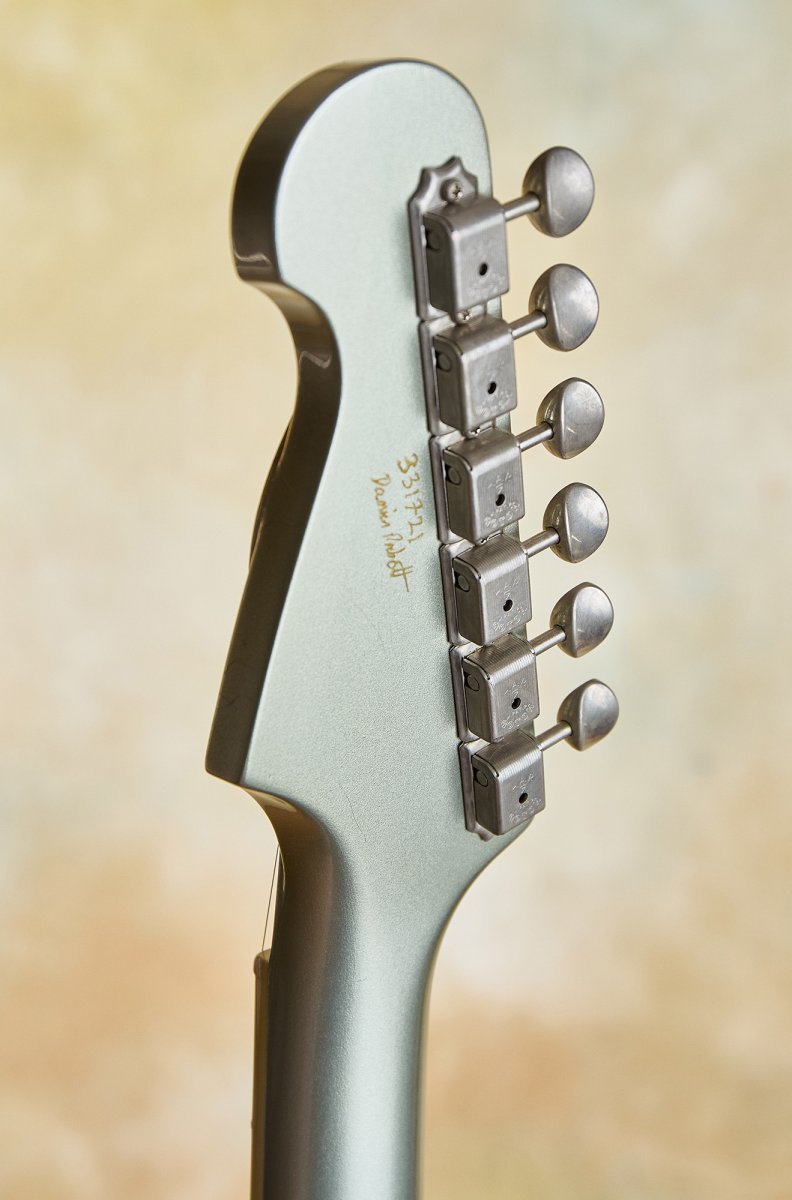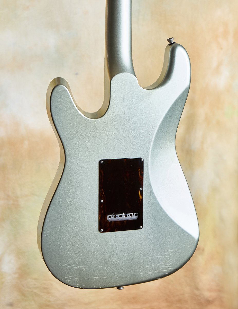 The aged Aztec silver finish is righteous—stunning and warm against that tortoiseshell pickguard. Fit and finish are at the highest level throughout. This guitar is resonant and acoustically satisfying.