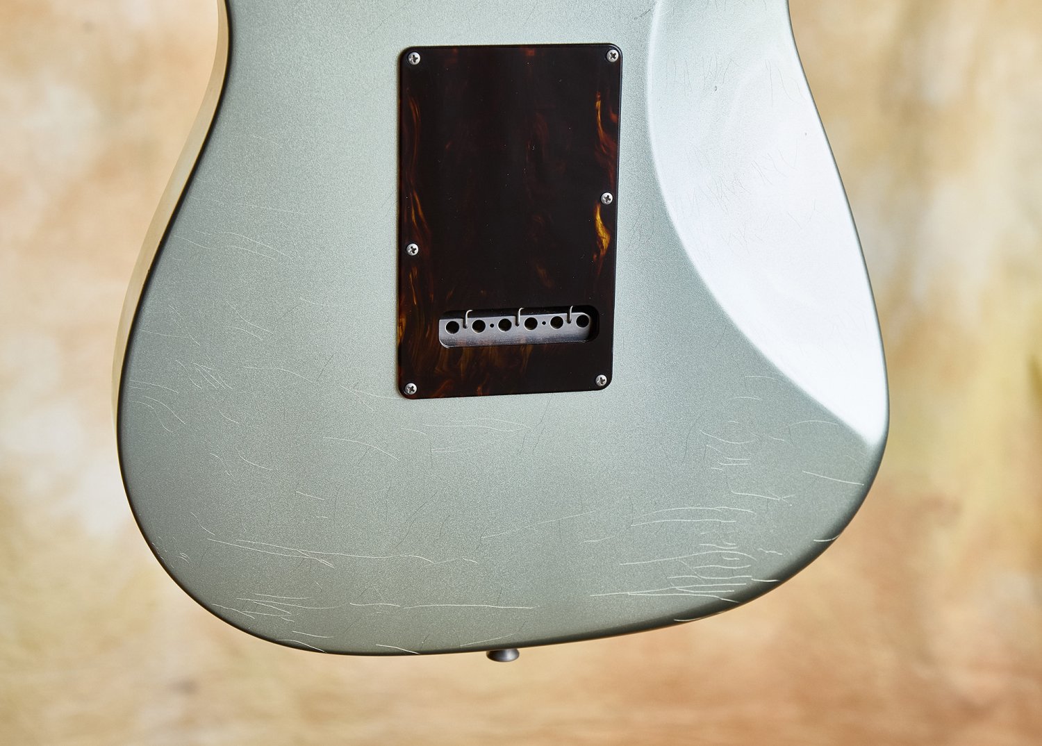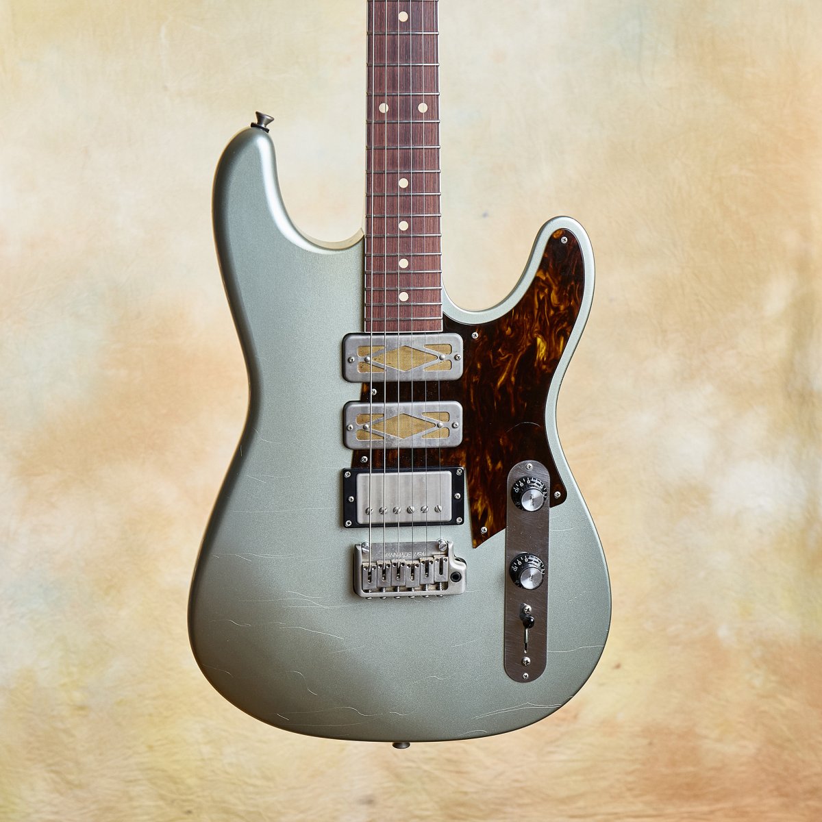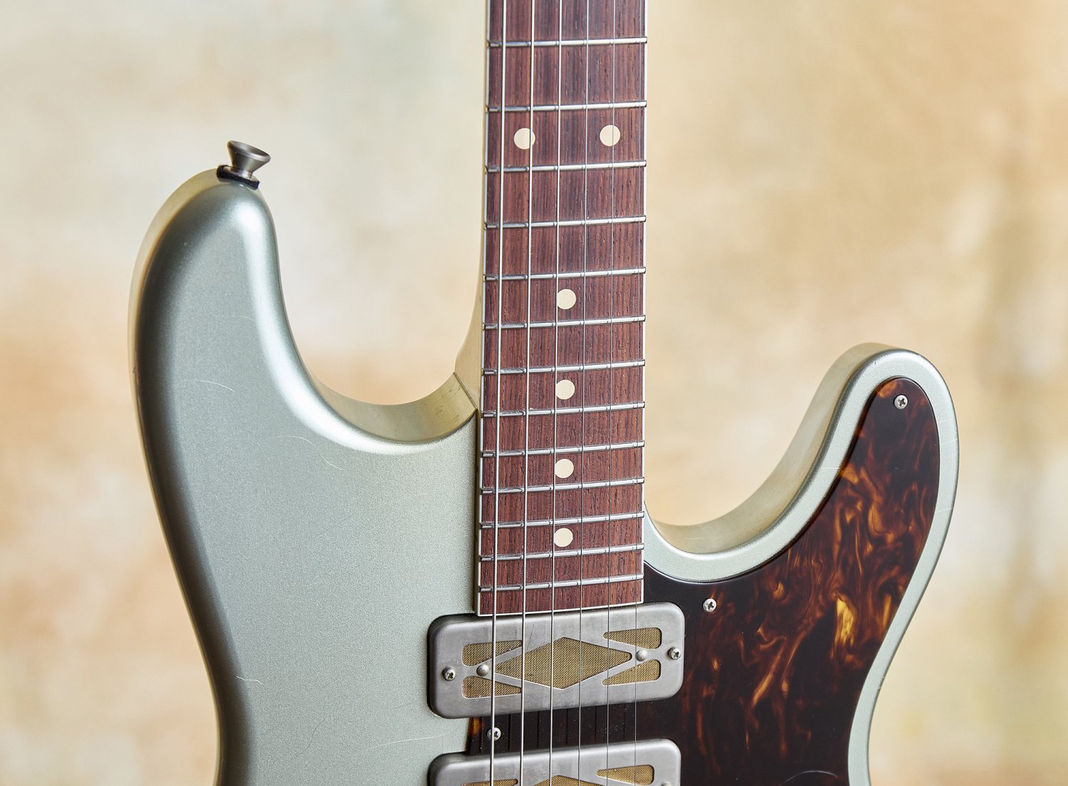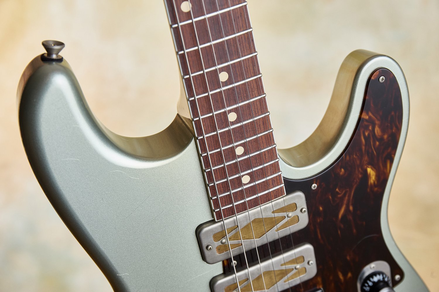 The aged Aztec silver finish is righteous—stunning and warm against that tortoiseshell pickguard. Fit and finish are at the highest level throughout. This guitar is resonant and acoustically satisfying.