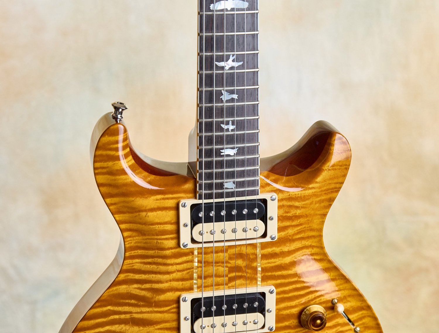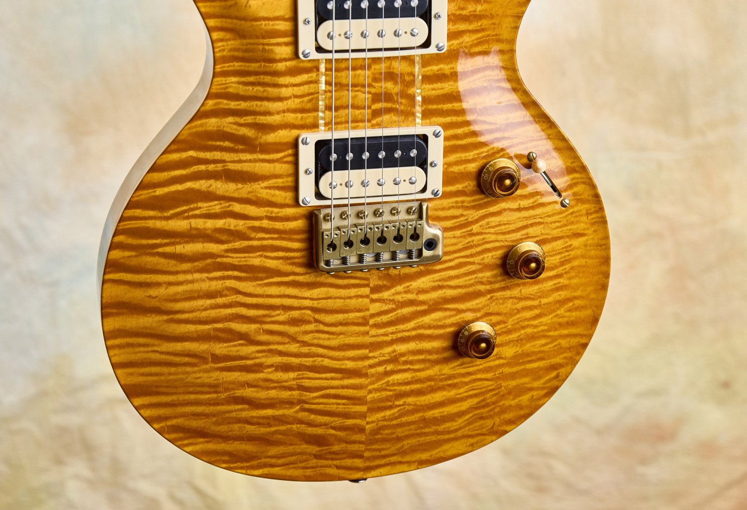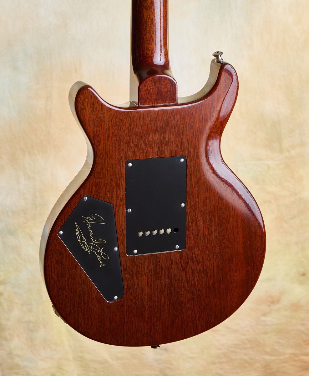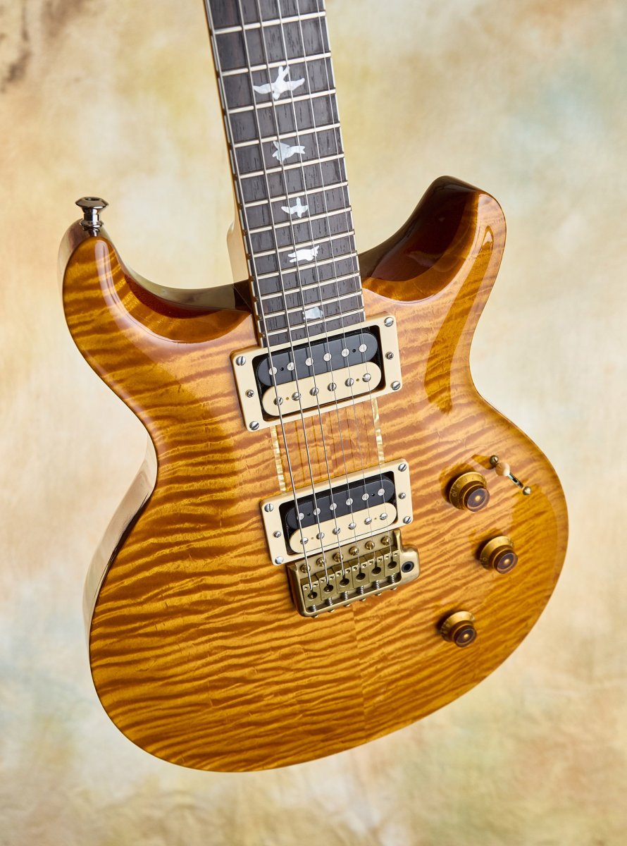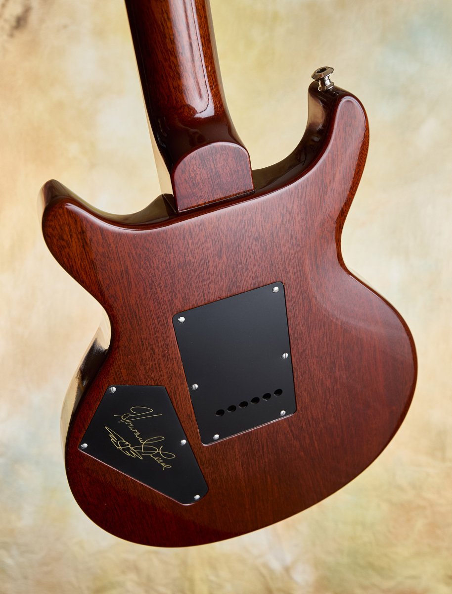 The details are faithful to Howard's original in every way. The East Coast curly maple top includes the filled-in drawer hole, a charming nod to the dresser that started it all. The modified Santana-style body carve replicates the exact dimensions of Howard's guitar. The pre-factory Santana headstock shape with its ebony veneer and mother-of-pearl Private Stock eagle recalls a time before PRS was even a company, when Paul was still hand-building guitars one at a time.