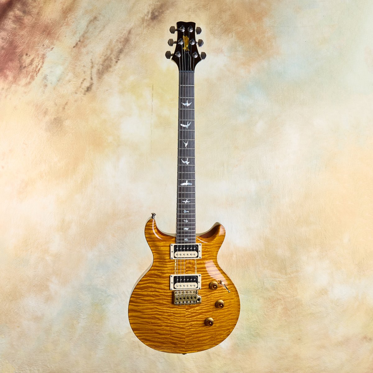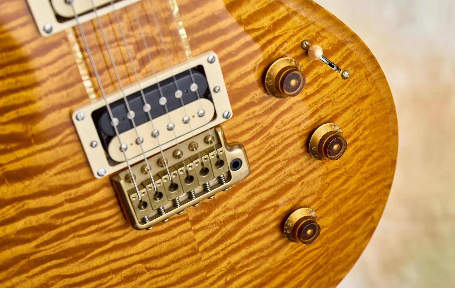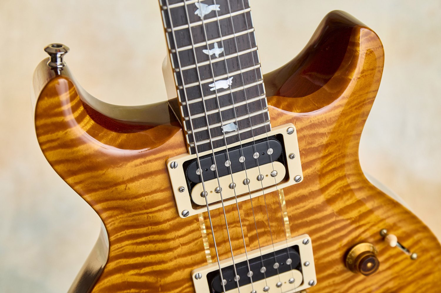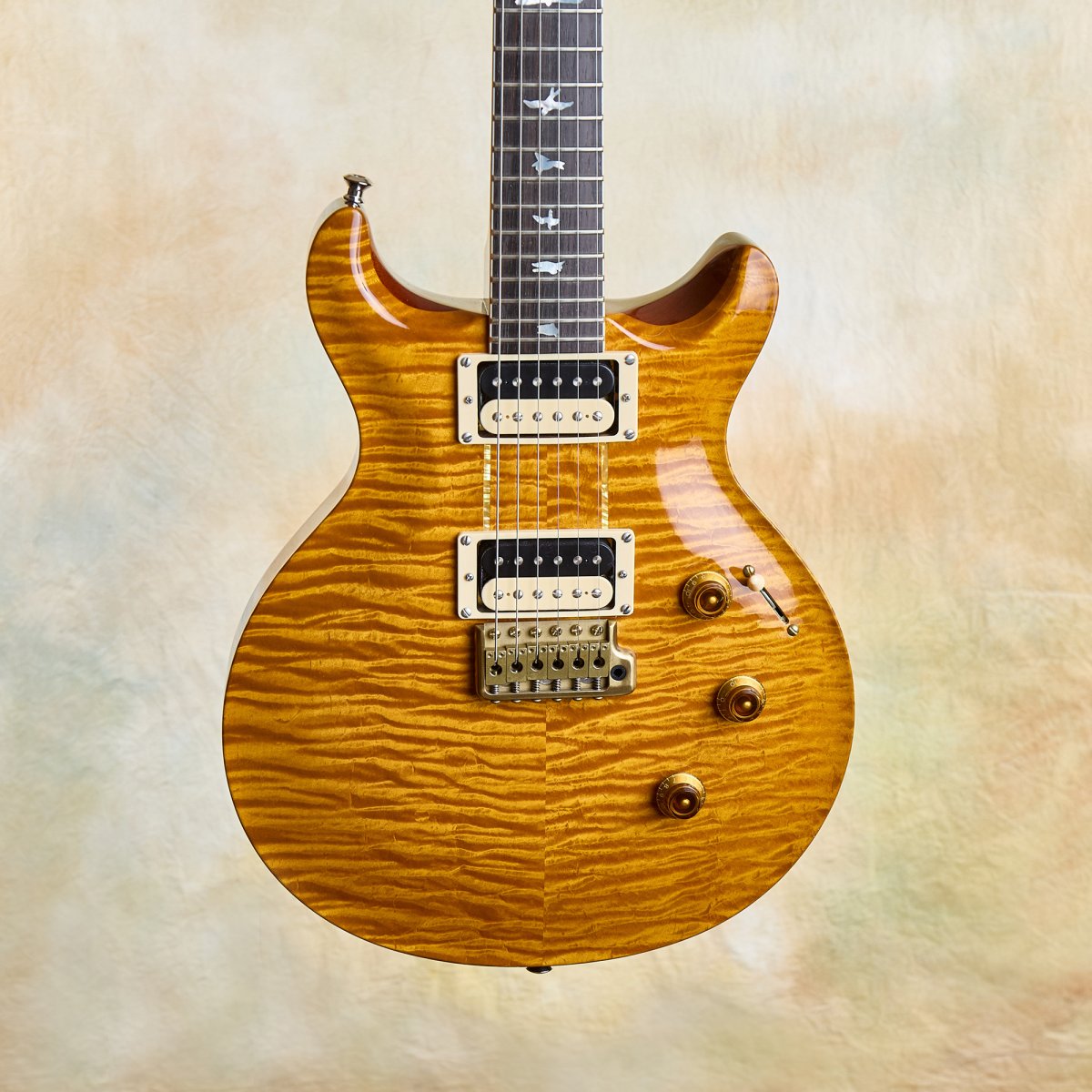 The details are faithful to Howard's original in every way. The East Coast curly maple top includes the filled-in drawer hole, a charming nod to the dresser that started it all. The modified Santana-style body carve replicates the exact dimensions of Howard's guitar. The pre-factory Santana headstock shape with its ebony veneer and mother-of-pearl Private Stock eagle recalls a time before PRS was even a company, when Paul was still hand-building guitars one at a time.