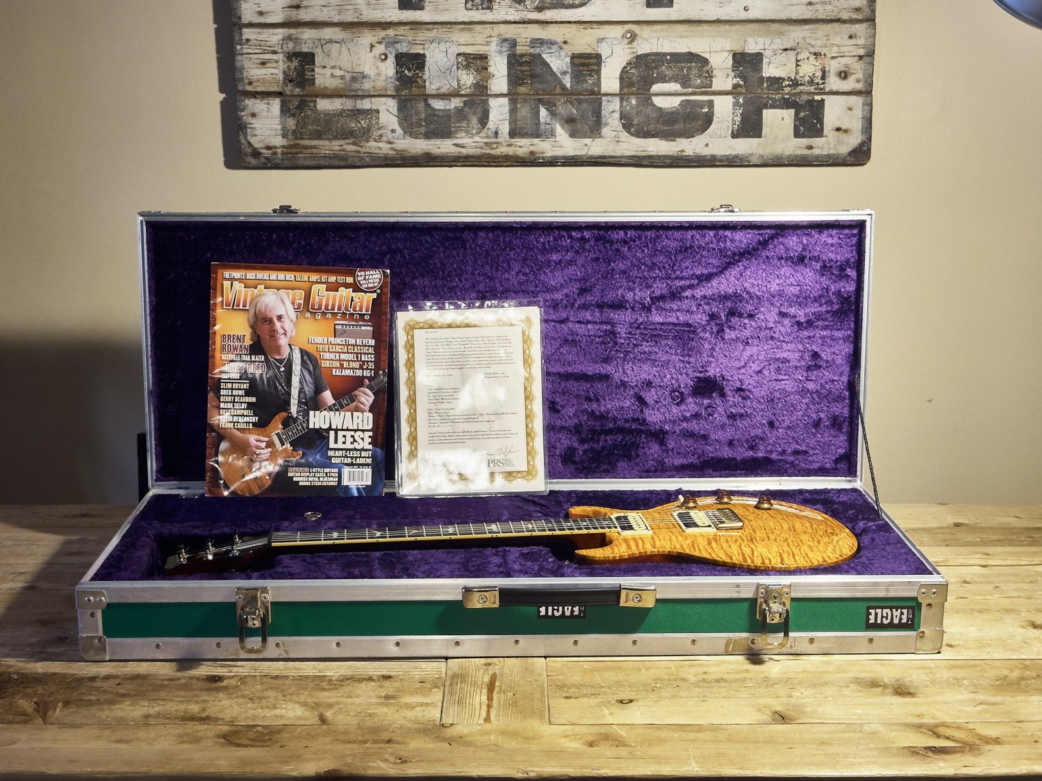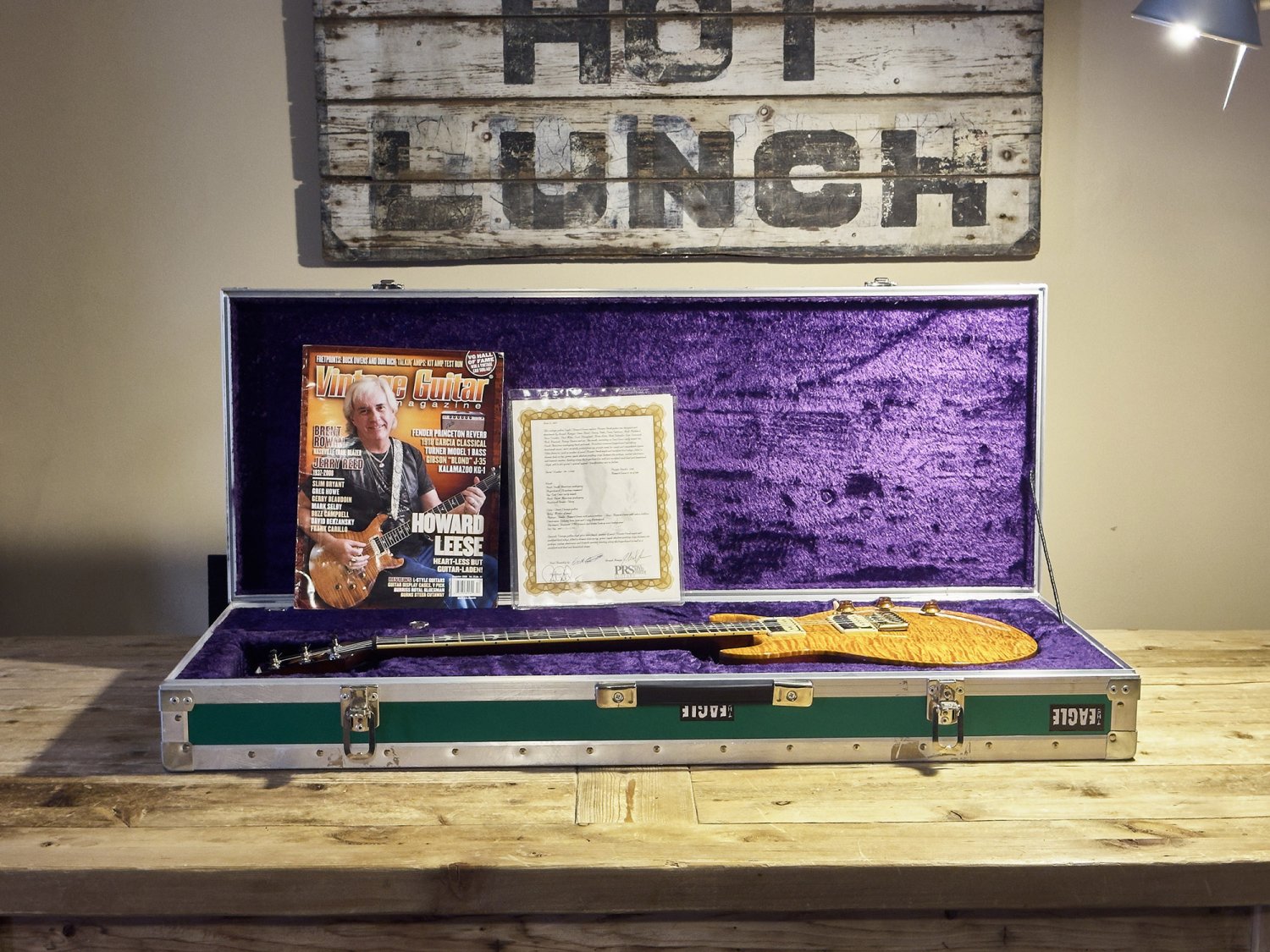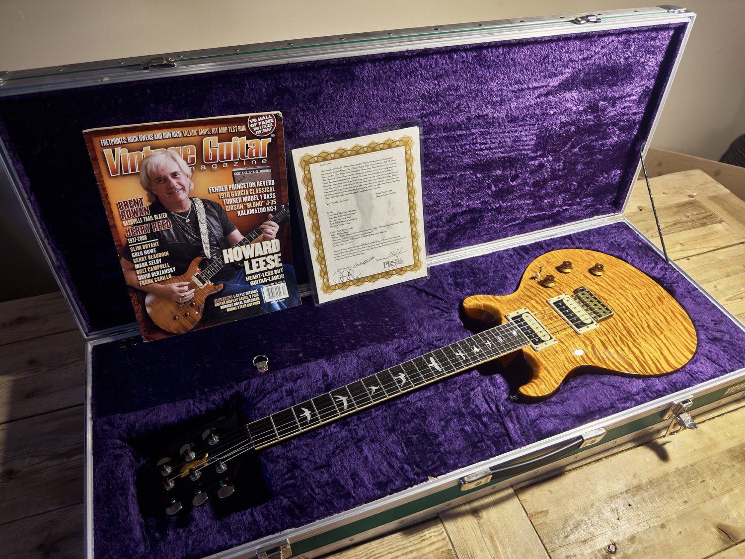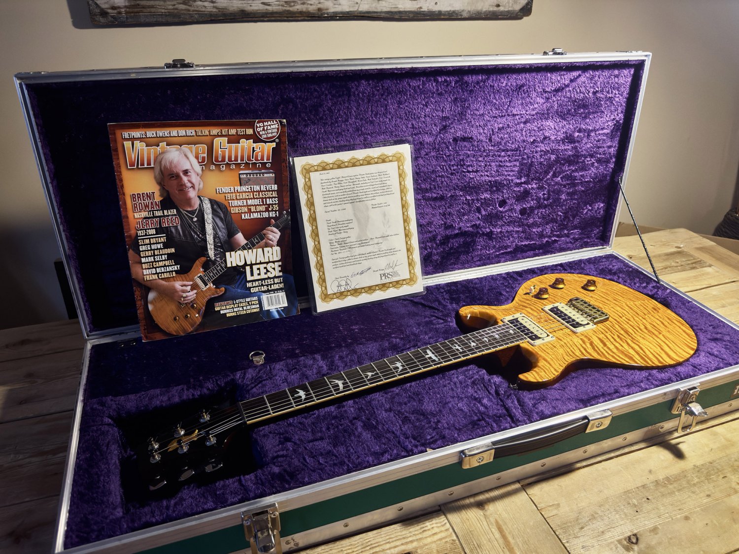 In 2009, the PRS Private Stock team built 100 faithful reproductions of Howard's legendary Golden Eagle. Each one was handmade by the elite Private Stock builders, including the great Joseph Knaggs, and personally inspected and signed off by Paul Reed Smith. Our guitar is #56 of that run, and what makes it especially significant is that it came directly from Howard Leese himself. Howard actually played this specific guitar on multiple occasions as a stand-in for his irreplaceable original. A Letter of Authenticity is included.