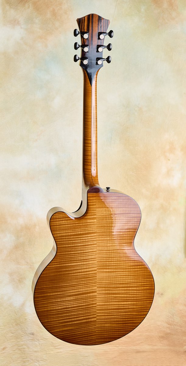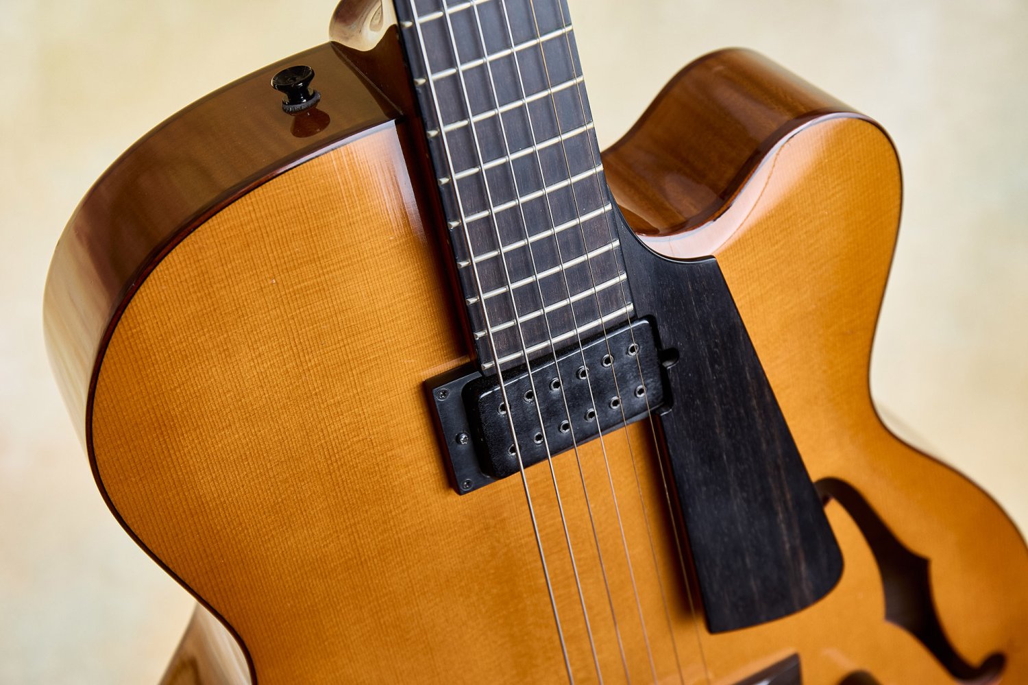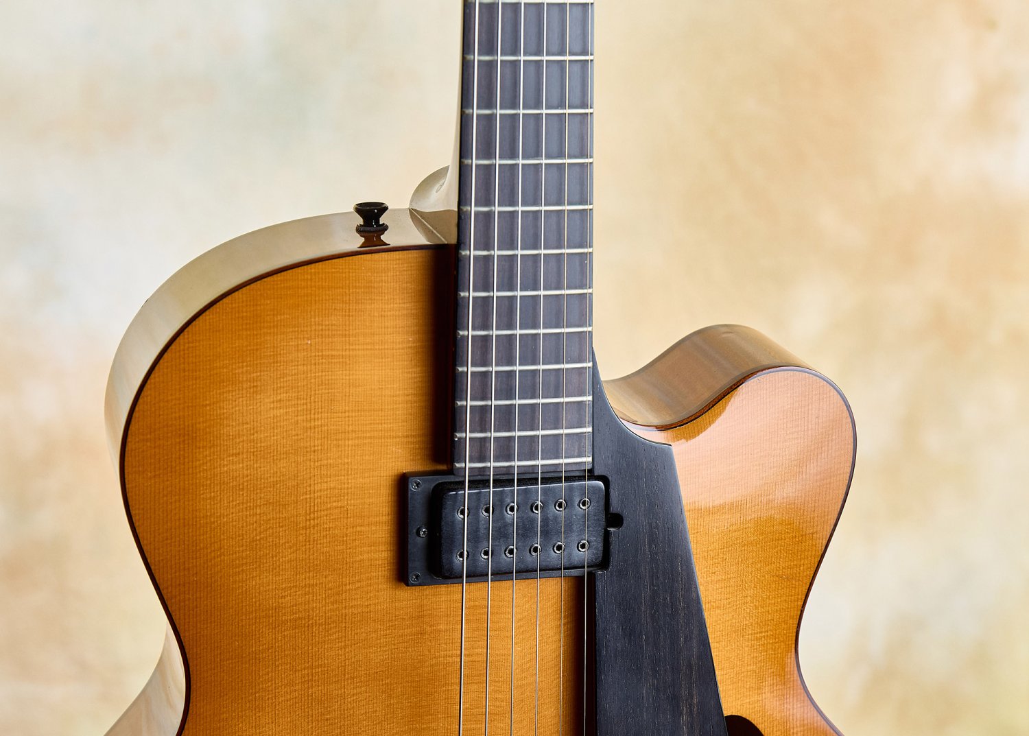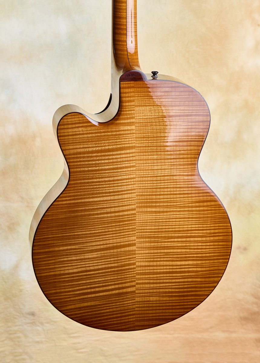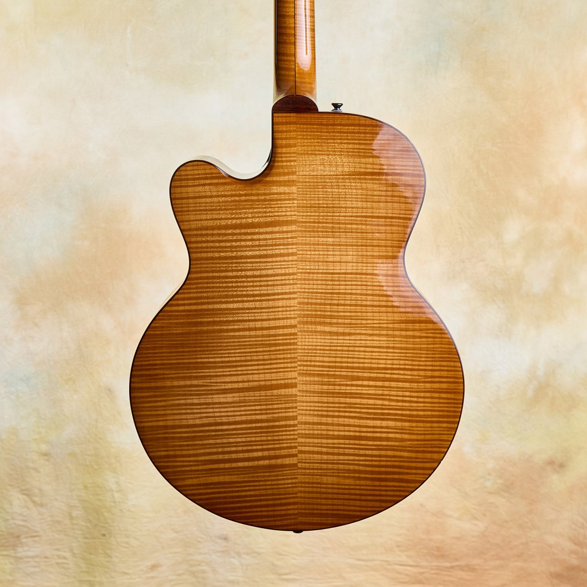 The neck carve reminds me of a D'Aquisto profile—so inviting that it's hard to put down. The aesthetic here is all about the wood itself. The light violin finish lets the carefully selected tonewoods speak for themselves, and the built-in pickup retains all the acoustic character while delivering that classic jazz sound Wes Montgomery made famous.