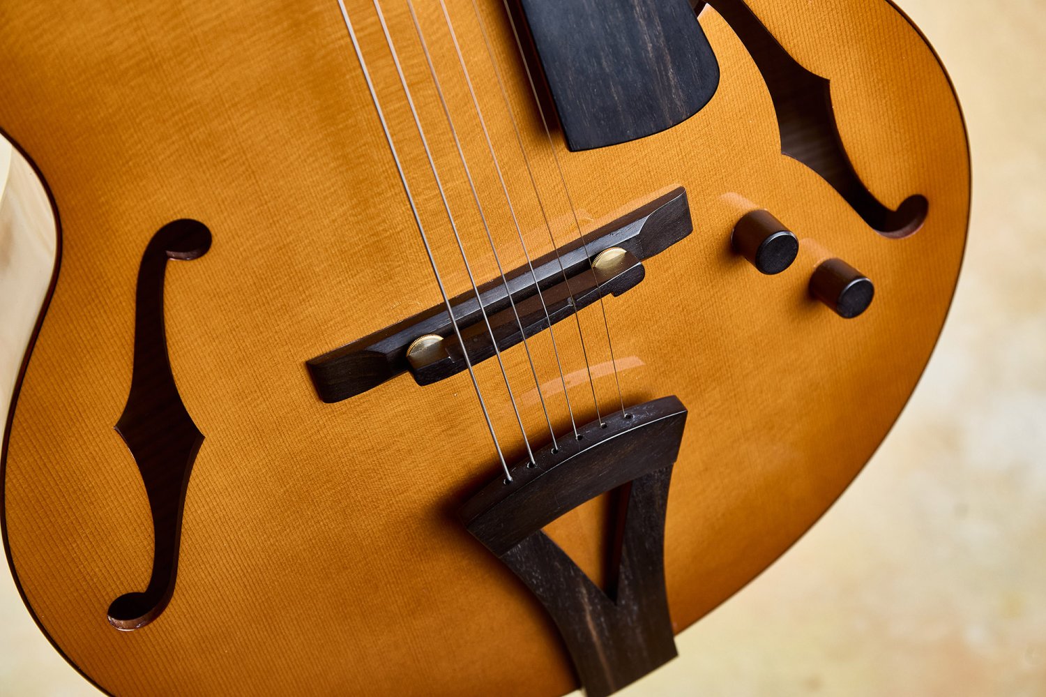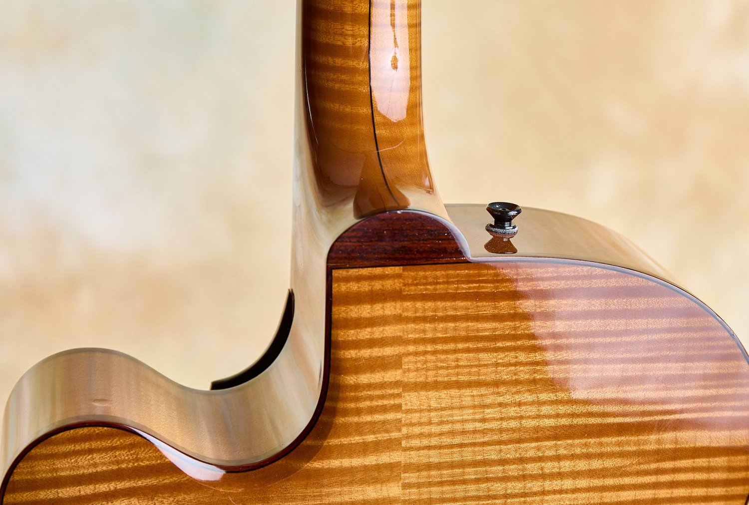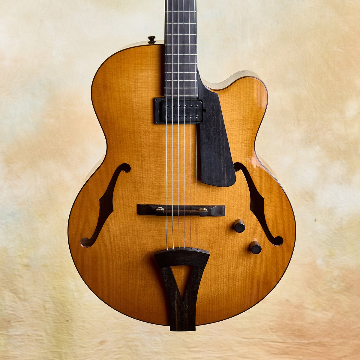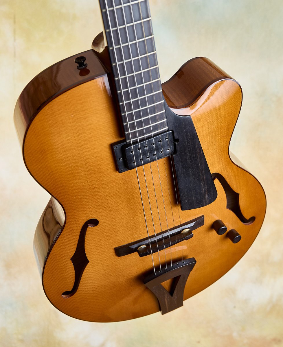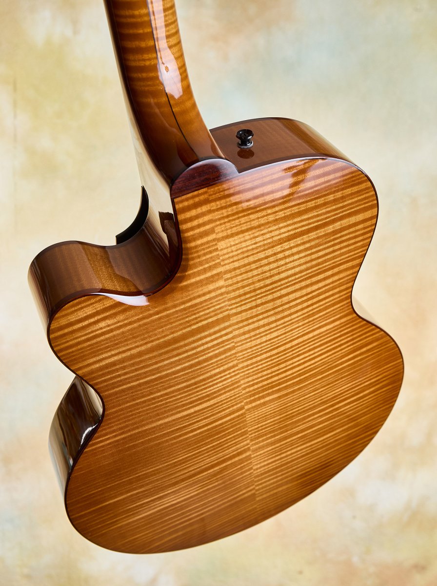 The neck carve reminds me of a D'Aquisto profile—so inviting that it's hard to put down. The aesthetic here is all about the wood itself. The light violin finish lets the carefully selected tonewoods speak for themselves, and the built-in pickup retains all the acoustic character while delivering that classic jazz sound Wes Montgomery made famous.
